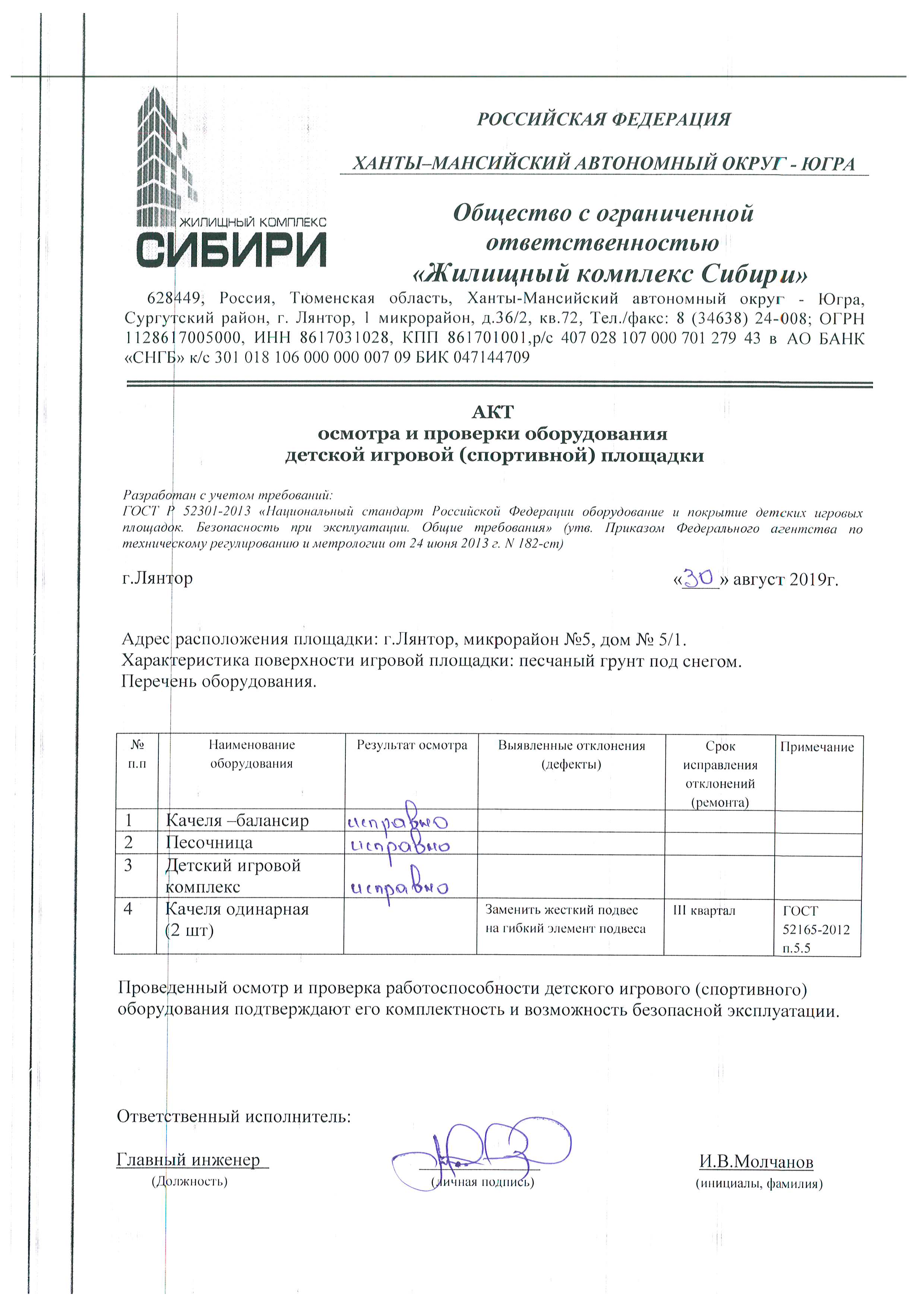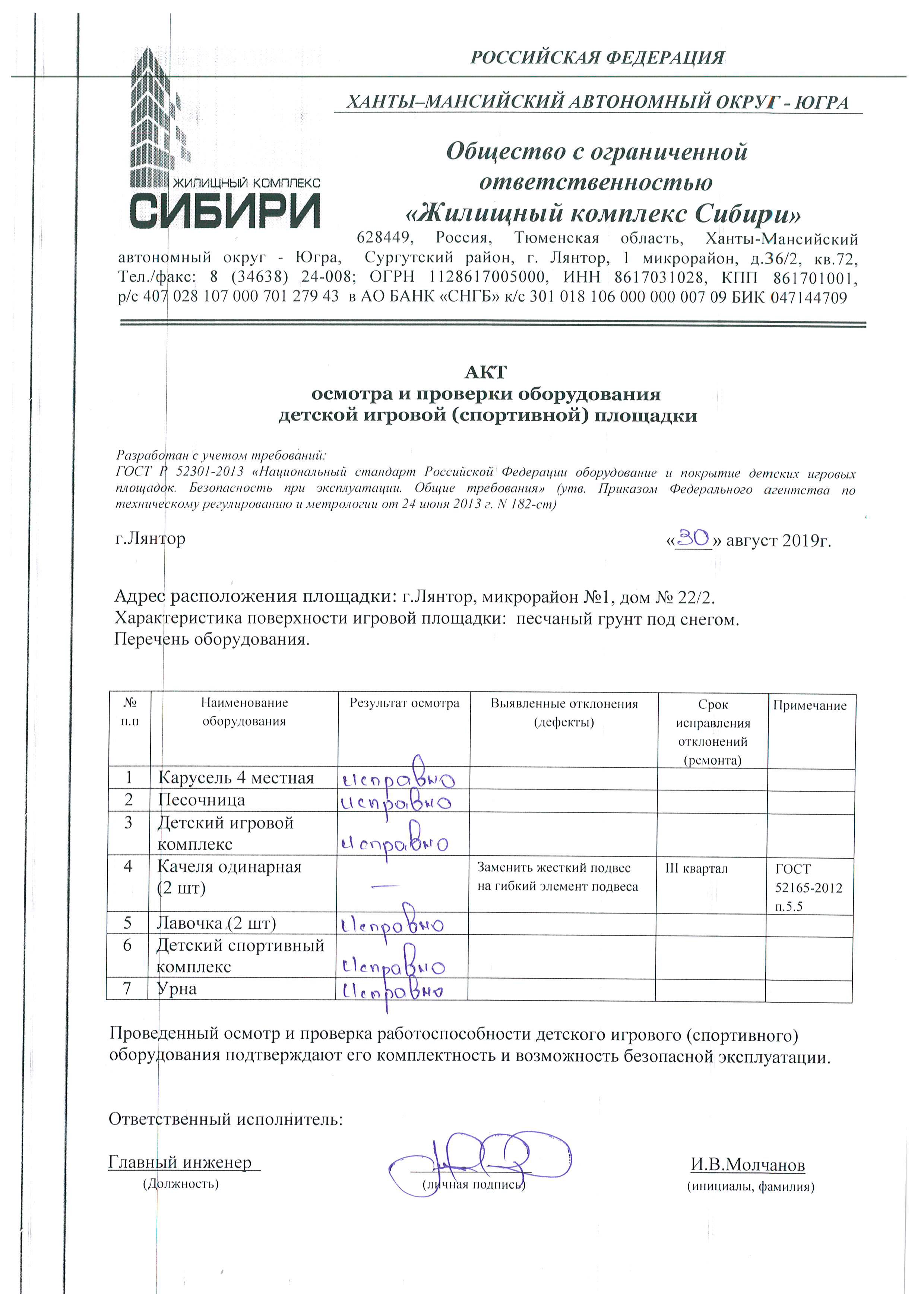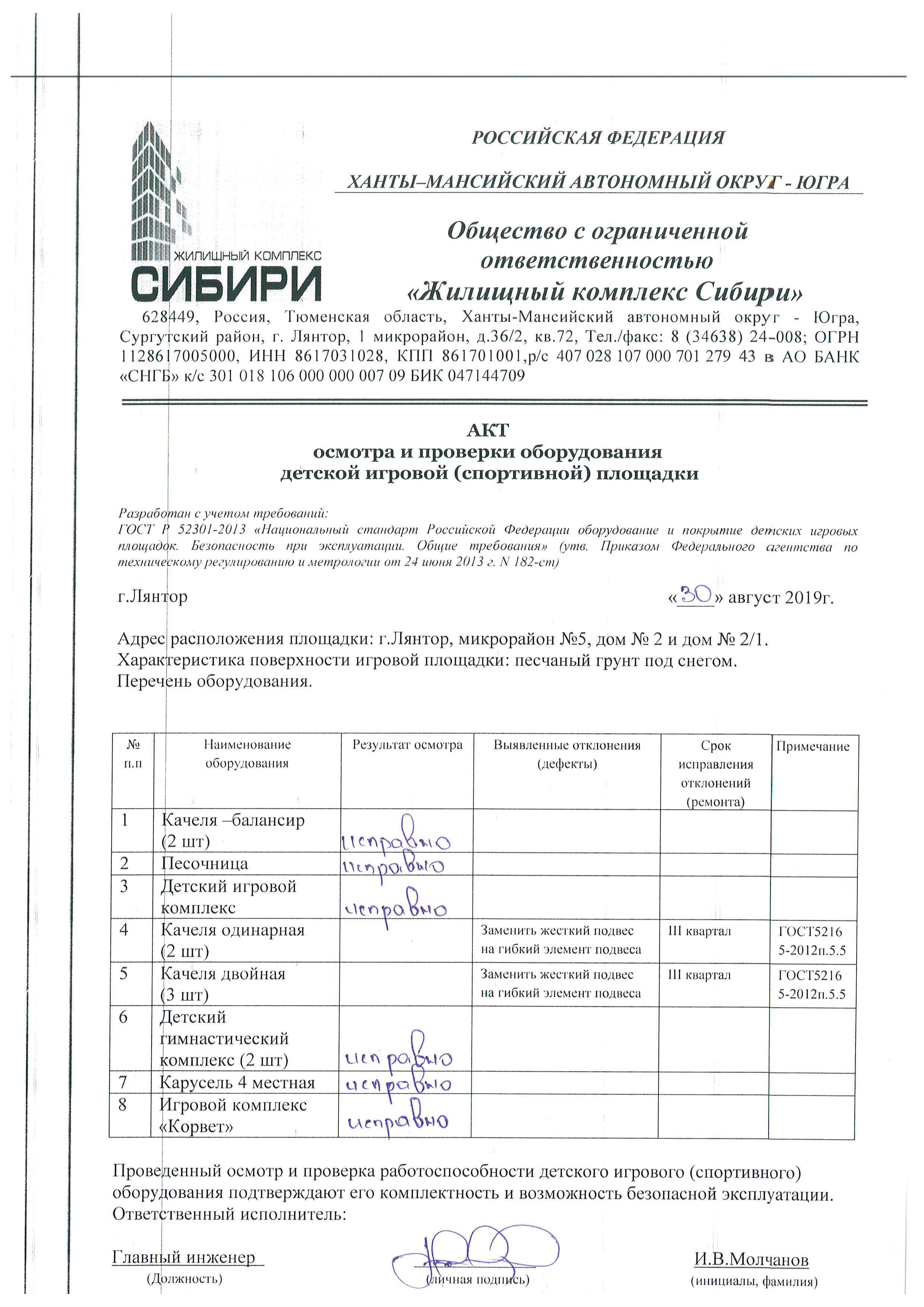 Акт осмотра и проверки оборудования детской игровой (спортивной) площадки от 30.08.2019